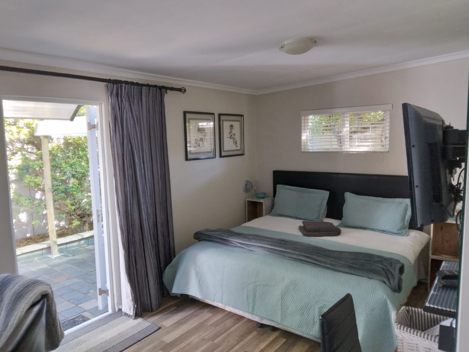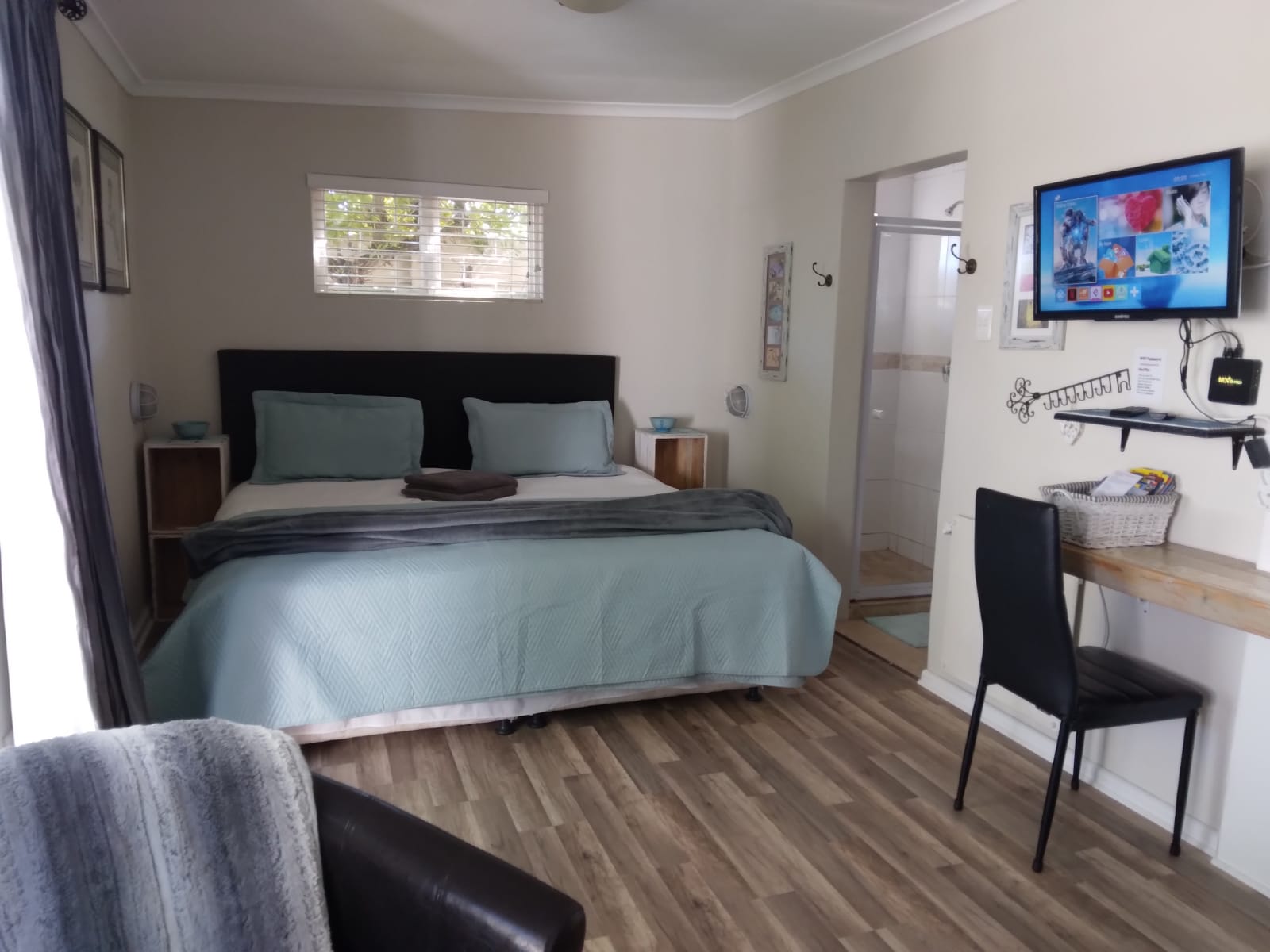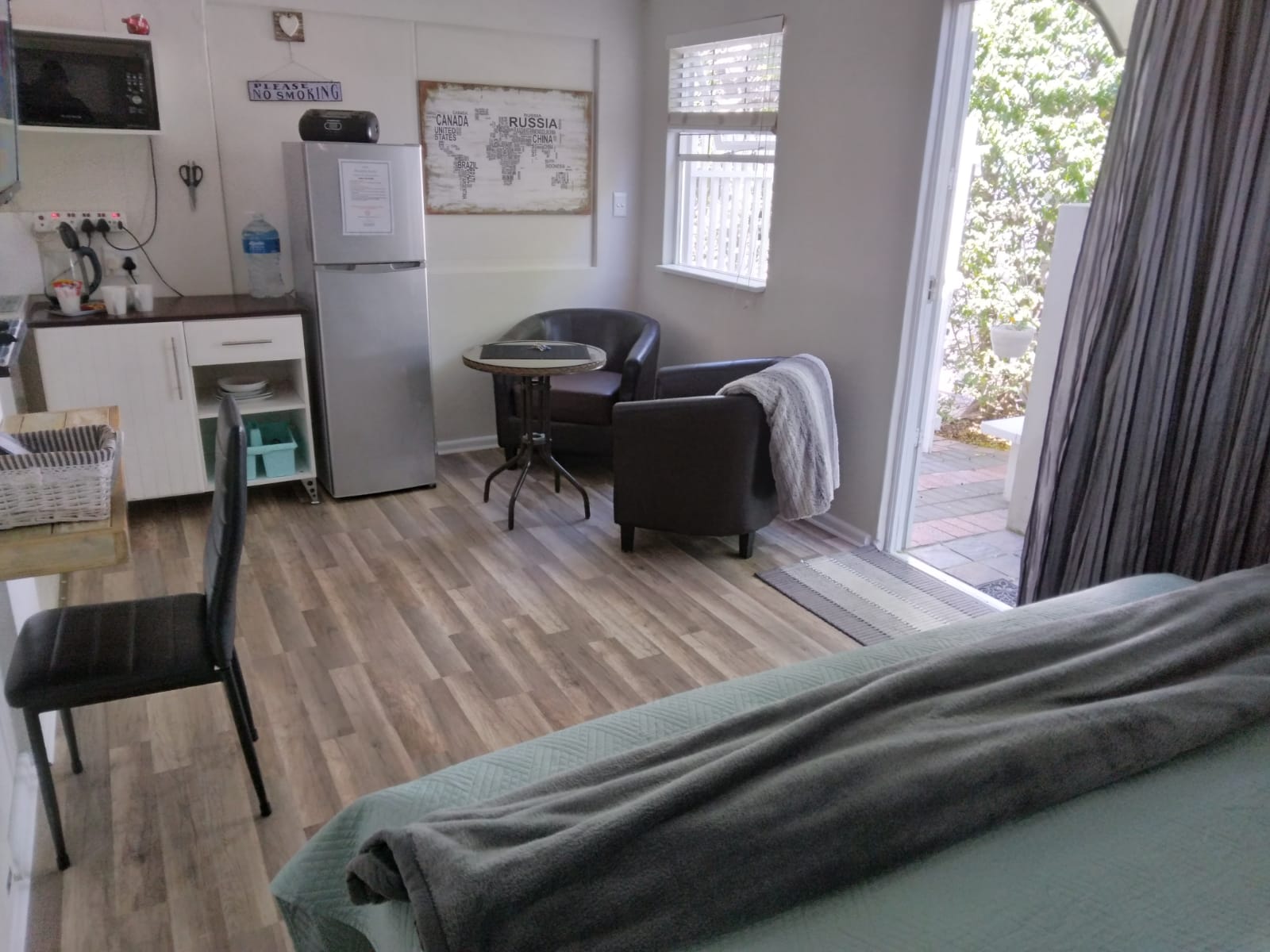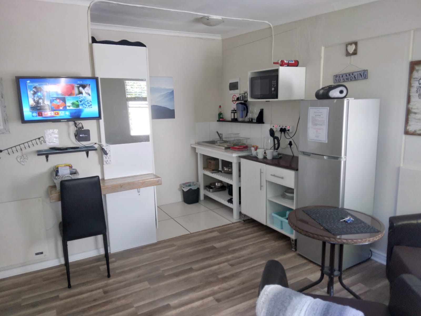 Kitchenette fully equipped with a television, fridge, microwave, toaster, kettle, 2 plate cooker, crockery, cutlery, pots and pan, radio, mini-safe and a breakfast nook.